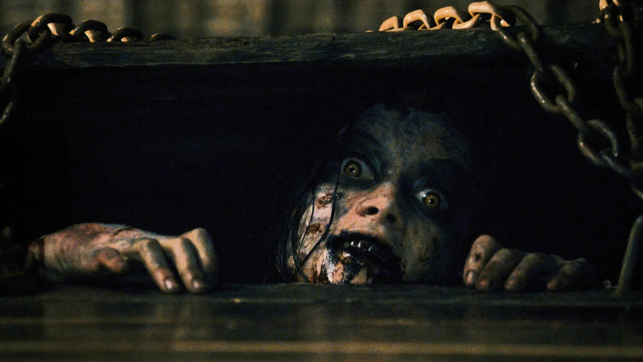Beş genç, Mia’nın eroin bağımlılığından kurtulması için izole bir kulübeye gelir; ancak kulübenin altında asılı duran cesetler ve kanla yazılmış uyarılar, buranın sıradan bir yer olmadığını fısıldar. Eric adlı meraklı arkadaş, bodrumdaki deri kaplı kitabı açar ve Sümer büyülerini okur; bu, ormandaki eski bir iblisin uyanmasına neden olur. Mia, pencereden dışarı fırlayıp ormana kaçar ve dallar tarafından tecavüze uğrar; döndüğünde ise gözleri şeytanın mührüyle parlar. Grup, “ele geçirilen” arkadaşlarını öldürmekten başka çare bulamaz: biri çivili tahta ile dövülür, biri iğneyle yüzüne enjekte edilir, biri elektrikli bıçakla parçalanır. David, kız kardeşini kurtarmak için son çare olarak onu gömer, sonra canlandırır; ancak Mia’nın bedeni artık tamamen iblisin kontrolündedir. Yağmur kan yağmaya başlar, kulübenin altı cehenneme döner. Finalde, testere ve benzinle dolu bir hesaplaşma sahnesi, ormanın ortasında patlayan bir kan gölüyle son bulur. Fede Álvarez’in yeniden çevrimi, orijinal serinin mizahını çıkarıp yerine saf vahşet koyar.
